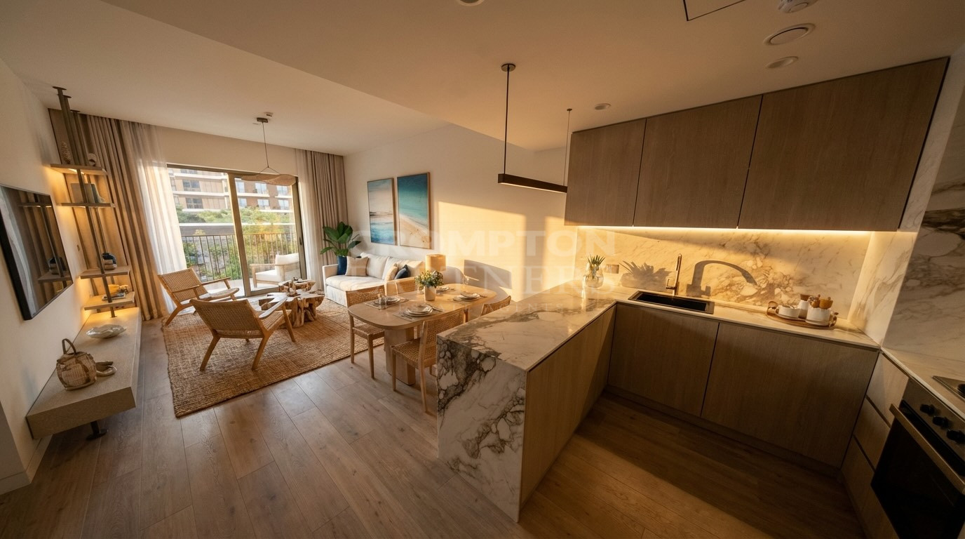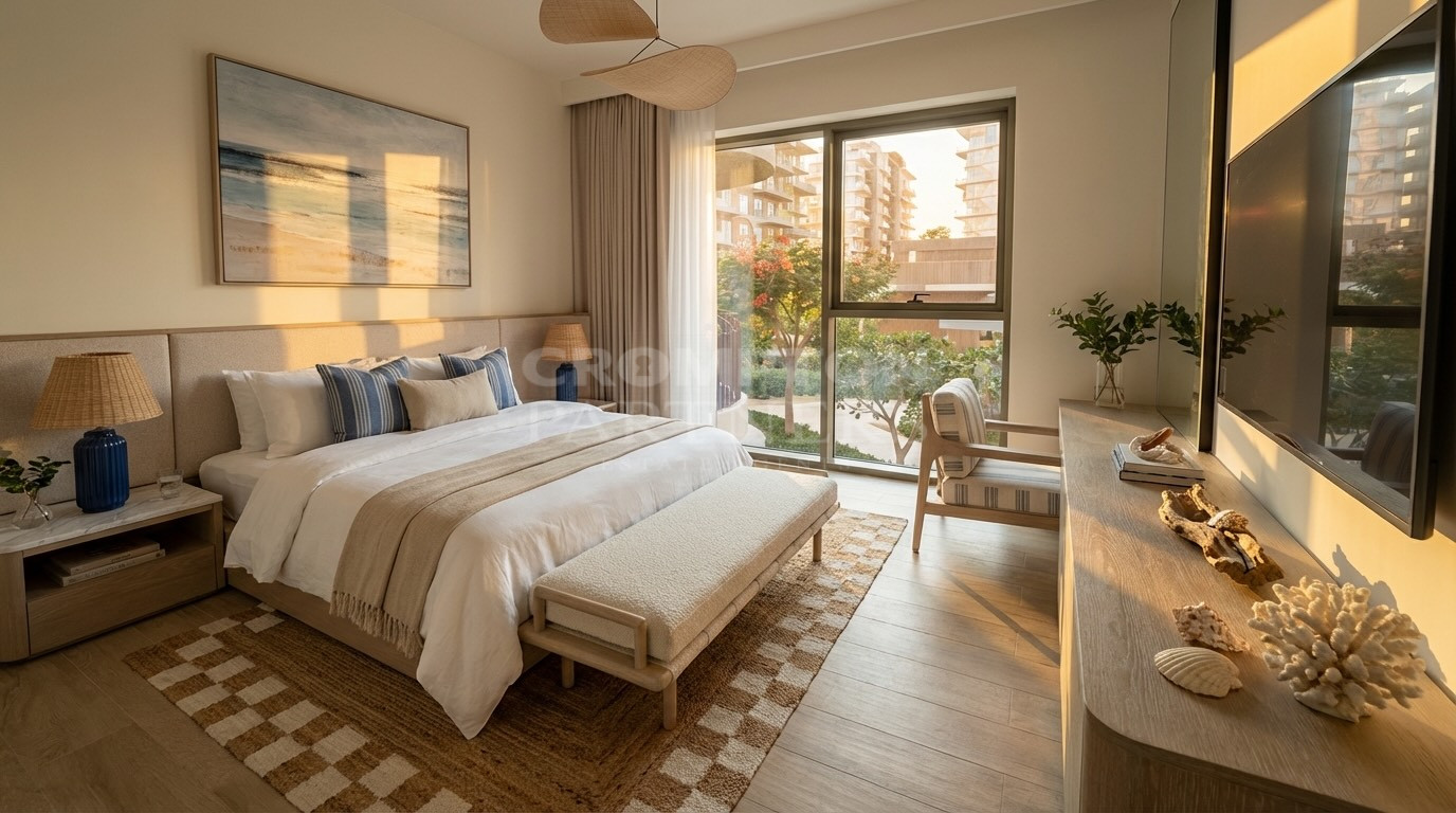 1 BR - 791.9 sq feet View - Gardenia View 65 /35 payment plan SP - 2,760,000/- The 1-bedroom apartment with a garden view at The Beach House is meticulously crafted to offer a seamless blend of functionality and elegance. The layout is designed to maximize space, natural light, and connection to the lush surroundings. The open-plan living and dining area serves as the heart of the home, featuring floor-to-ceiling windows that frame verdant garden views and invite ample sunlight. The living area flows effortlessly into a private balcony, perfect for morning coffee or evening relaxation while overlooking the landscaped gardens below. The balcony, accessible through sliding glass doors, is an ideal spot for unwinding amidst the greenery, offering a private outdoor retreat. The fully fitted kitchen is a masterpiece of modern design, equipped with premium Italian appliances, sleek stone countertops, and high-end cabinetry. Available in light or dark finish palettes, the kitchen caters to diverse aesthetic preferences while maintaining a timeless appeal. The spacious bedroom is a sanctuary of comfort, complete with built-in wardrobes that provide ample storage without compromising on style. The en-suite bathroom is designed with spa-inspired fixtures, including premium fittings, elegant tiles, and a minimalist aesthetic that promotes relaxation. A guest washroom adds convenience for visitors, ensuring privacy for residents. The apartment also features central air conditioning and smart home technology, allowing for effortless control of lighting, temperature, and security systems. Every detail of the apartment reflects Aldar’s commitment to quality and sustainability. Energy-efficient lighting, water-saving fixtures, and natural ventilation systems are seamlessly integrated, aligning with the project’s LEED Silver and Estidama 3 Pearl certifications.